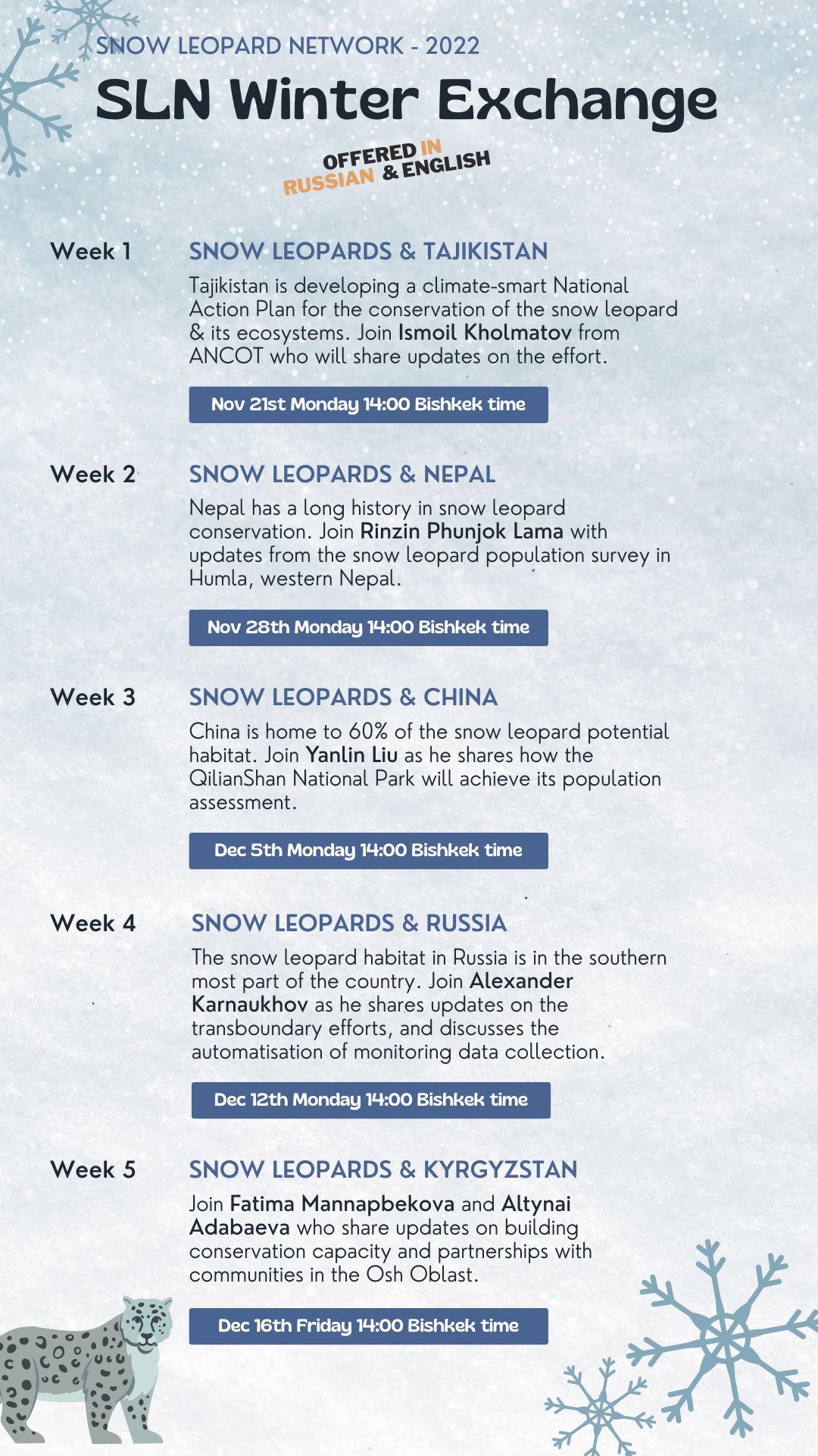 Welcome to the Snow Leopard Network’s Winter Exchange. The aim of the SLN Winter Exchange is to bring snow leopard researchers and conservations practitioners together from across the world and share the latest developments in snow leopard conservation programming and research. Our resource persons will share updates from different High Asia settings: we will travel and meet teams working in Tajikistan, Nepal, China, Russia and Kyrgyzstan. Each brief and inspiring talk will be followed by a discussion period where we explore ideas in further depth, drawing on the group’s experience and knowledge. All sessions will be offered with simultaneous translation in English and Russian.